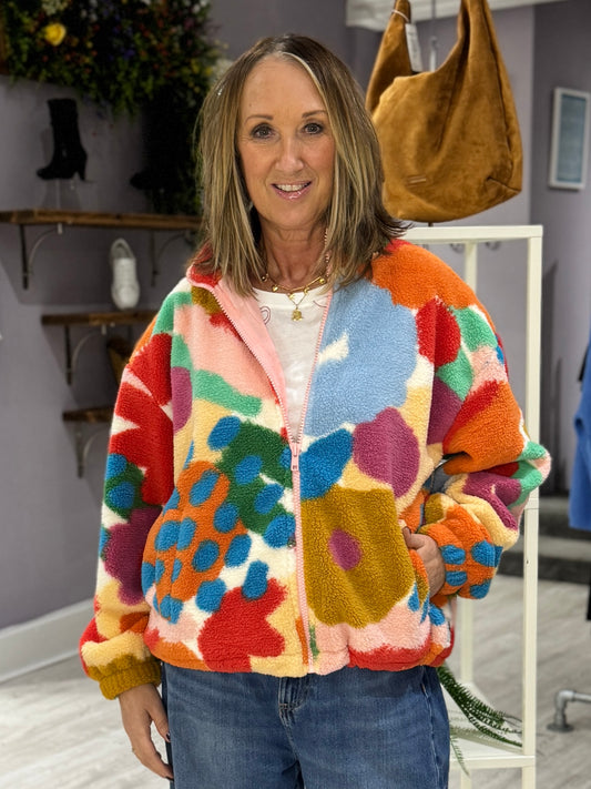 Sugarhill Hartley Zip Up Fleece - Off White/Multi, Abstract Floral