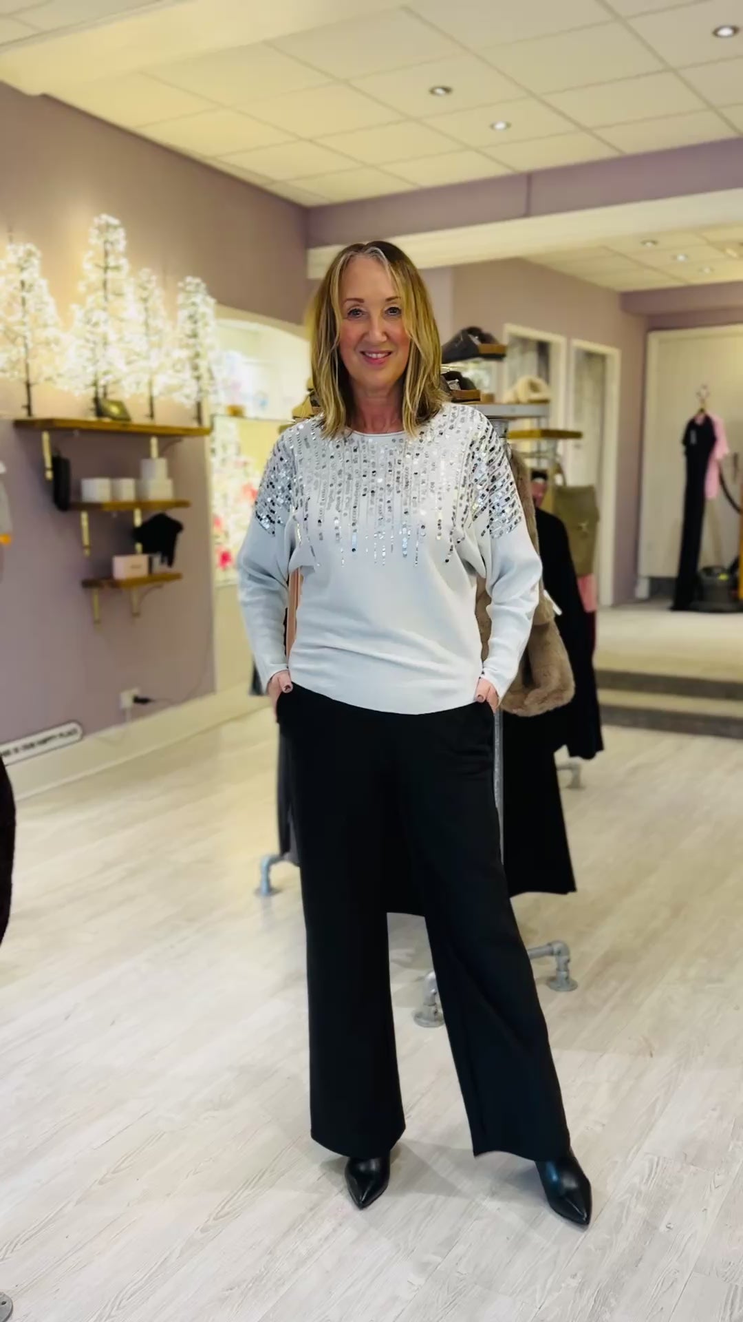 Turn heads with this stunning silver batwing jumper, designed for comfort and sparkle.