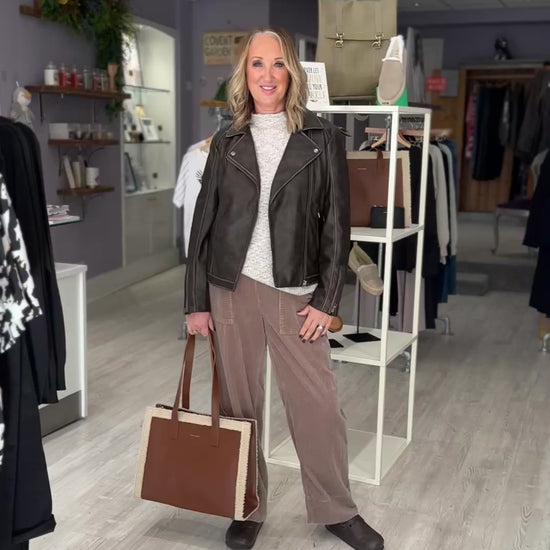 A gorgeous faux leather biker style jacket in the on trend chocolate colour. This jacket is super stylish and features an asymmetrical front zip, zippered cuffs and 2 front pockets.