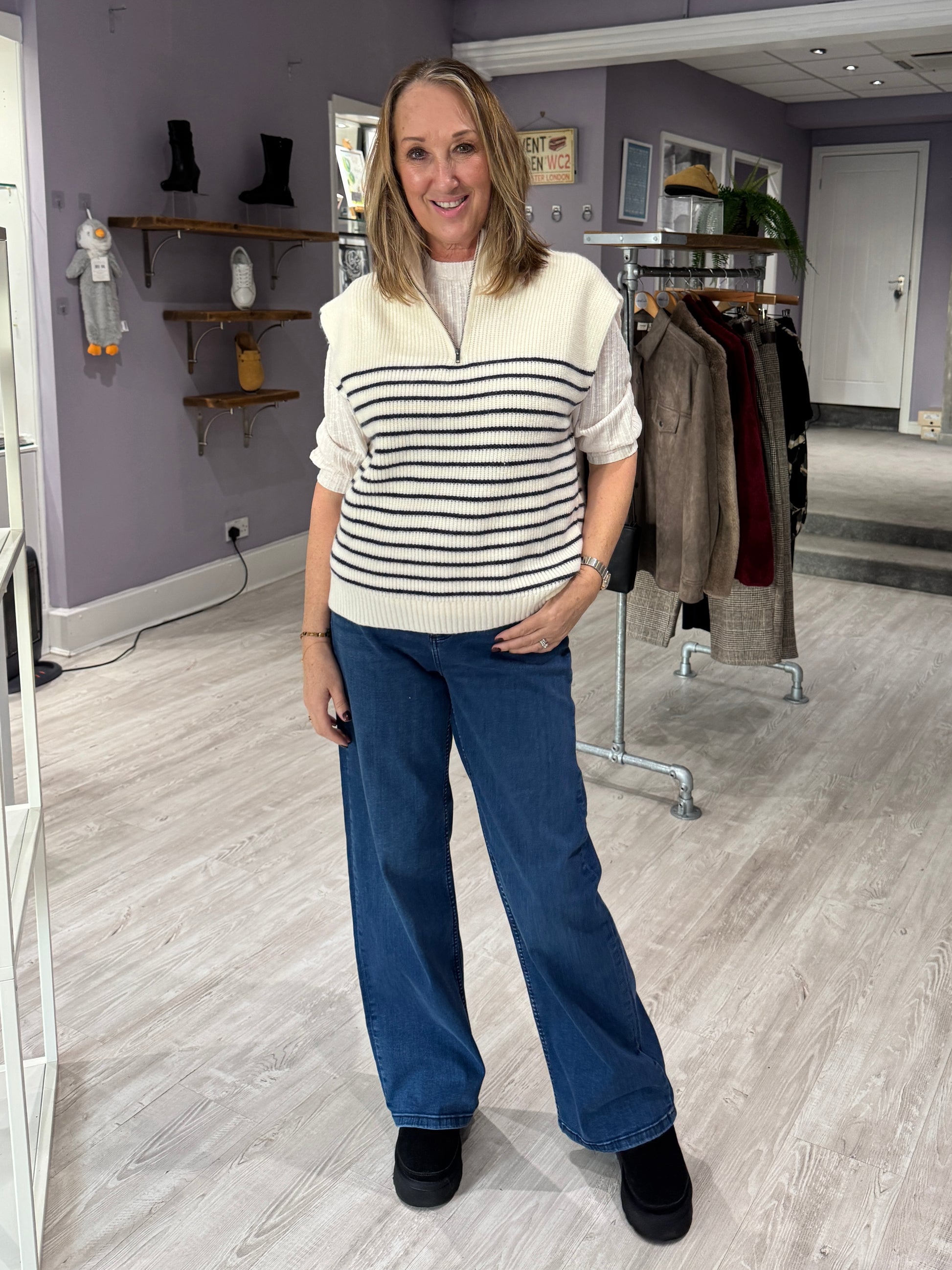 Layer up in effortless style with this super soft sleeveless jumper. Designed with a practical half-zip closure and finished with classic blue stripe detailing, it’s perfect for transitional dressing. Wear it over a shirt or tee for an easy, relaxed look with a polished edge.