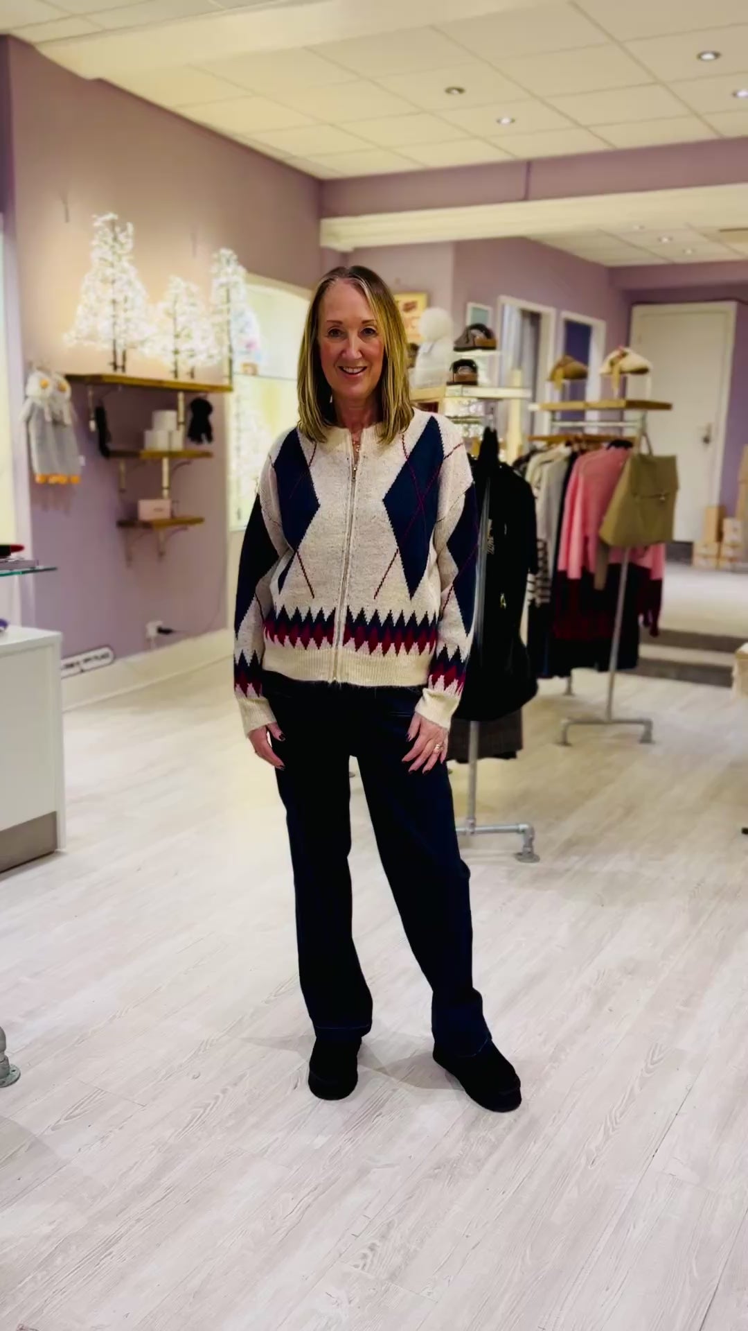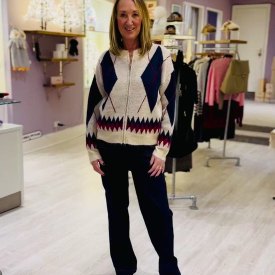 Zip into style with our round-neck argyle cardigan! The bold pattern and easy zip-up front make it the perfect throw-on for cool, relaxed vibes with a touch of retro charm. One Size to fit up to 16.