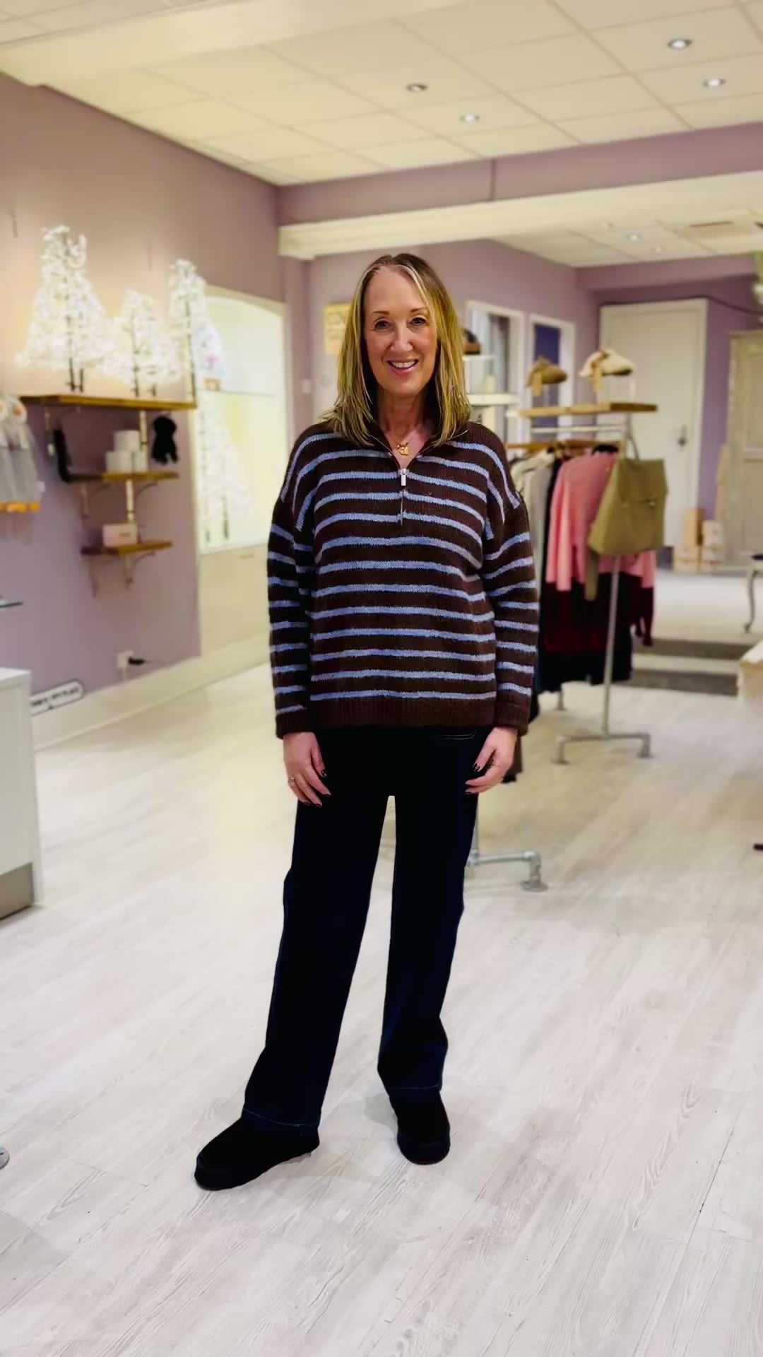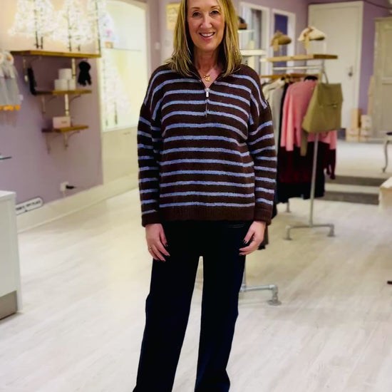 Our Half-Zip Striped Jumper features thin blue and brown stripes for a refined, modern look. With its smooth half-zip neckline and soft, comfortable knit, it’s the perfect layer for everyday style. One Size to fit up to 14