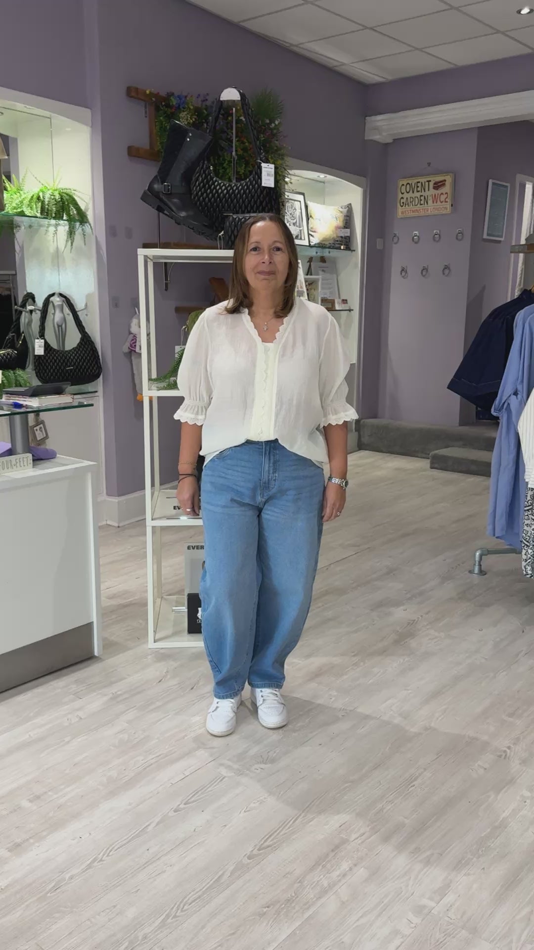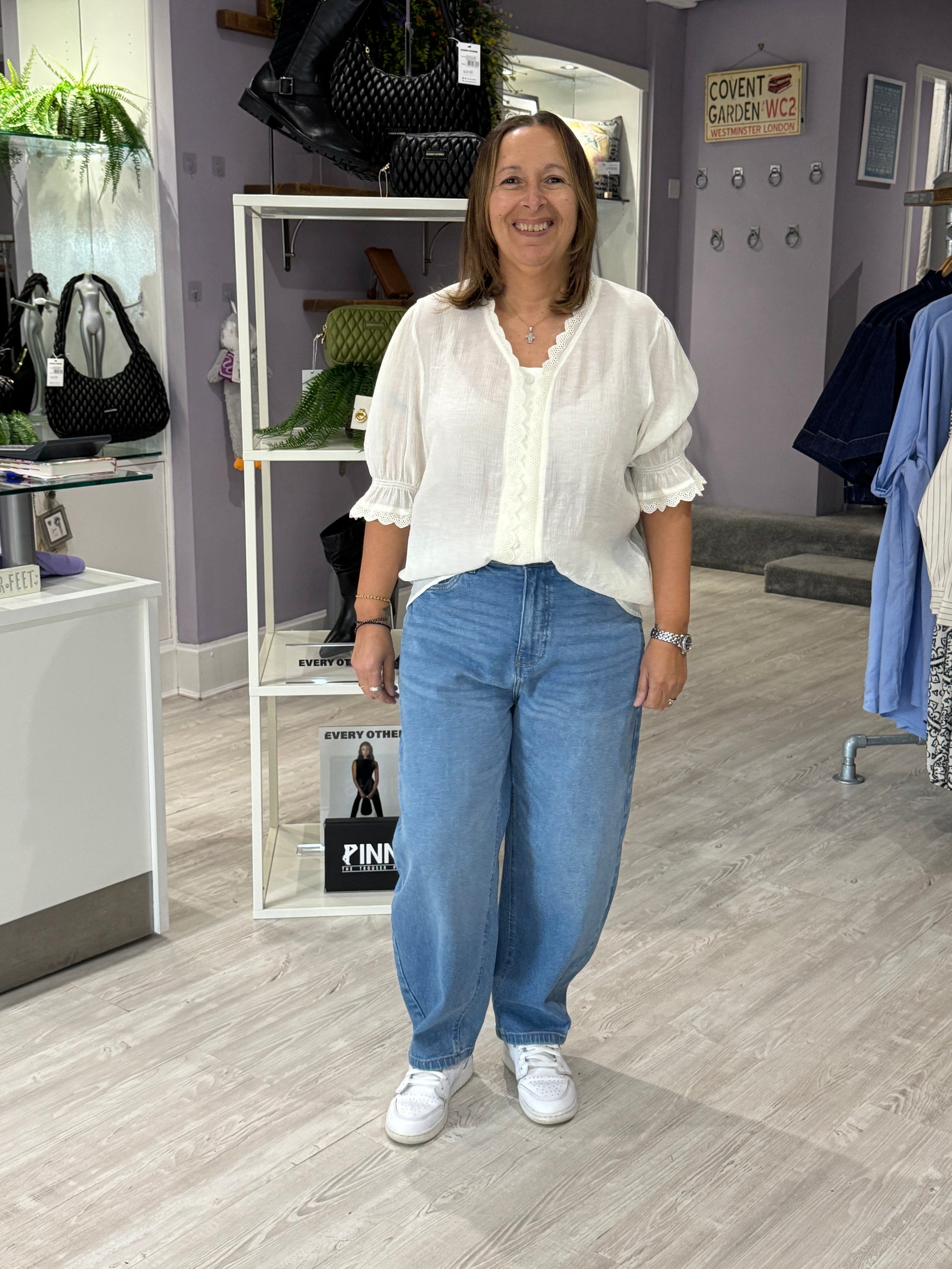 Blouse for women with relaxed fit, delicate scalloped neckline, and decorative trim. Features short sleeves with subtle ruffle cuffs. Designed for lasting comfort and versatile styling in any modern wardrobe.