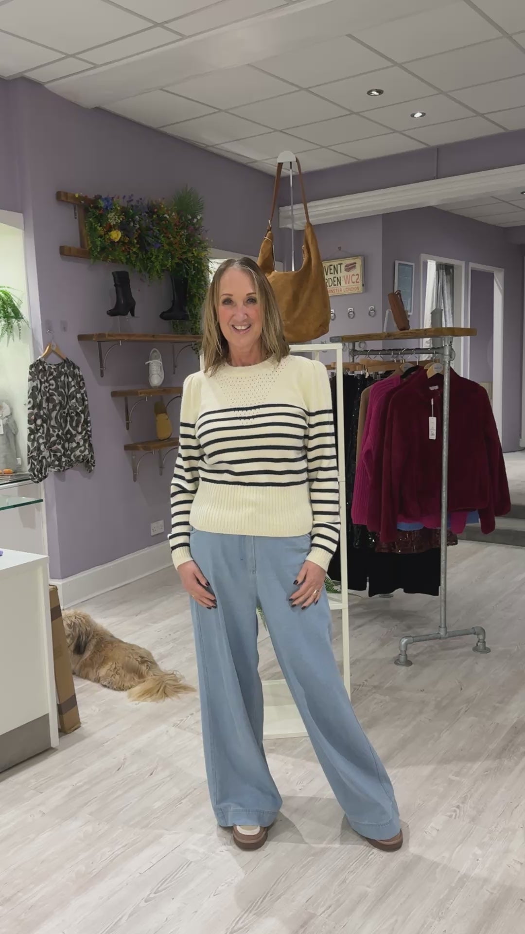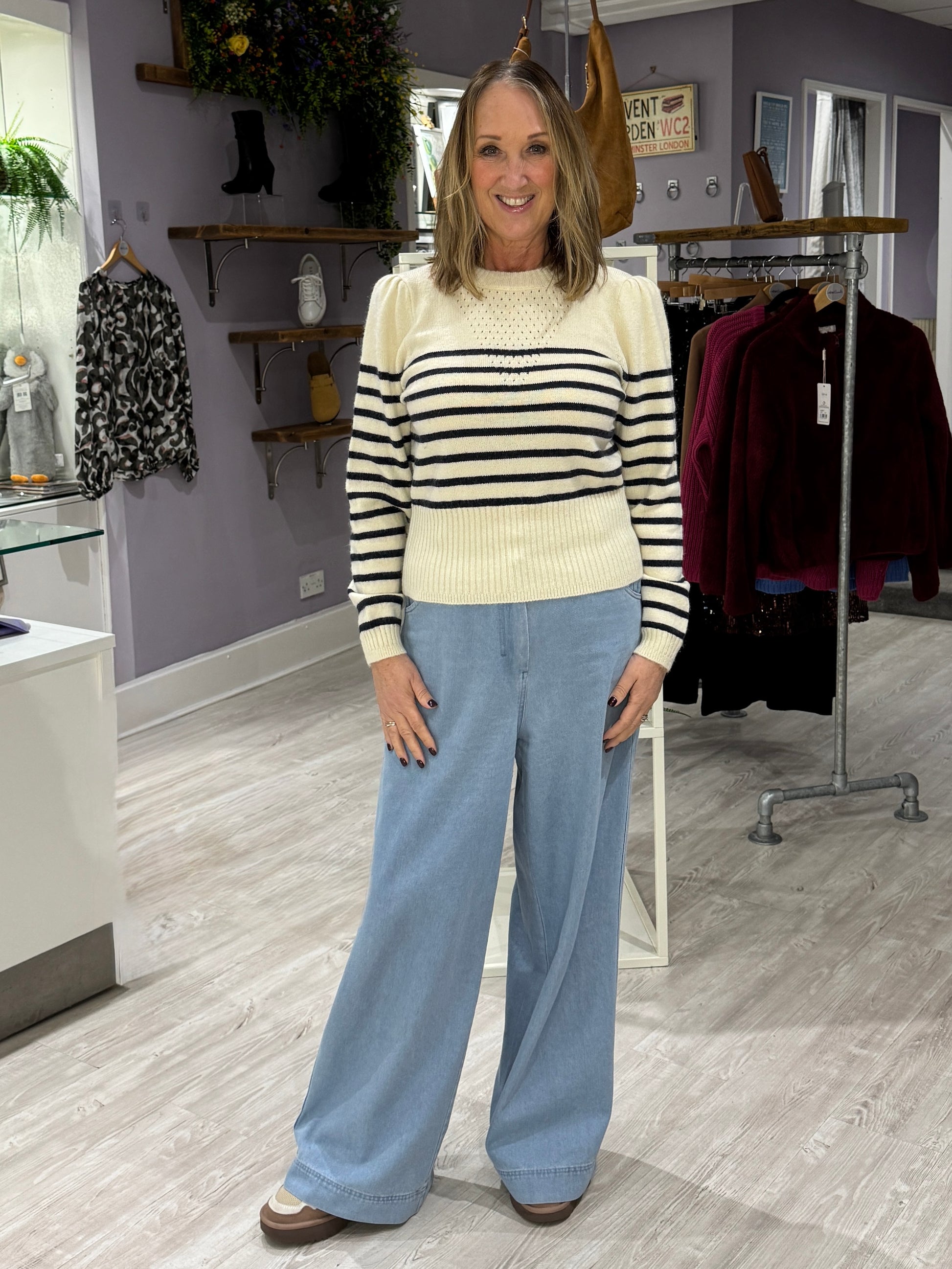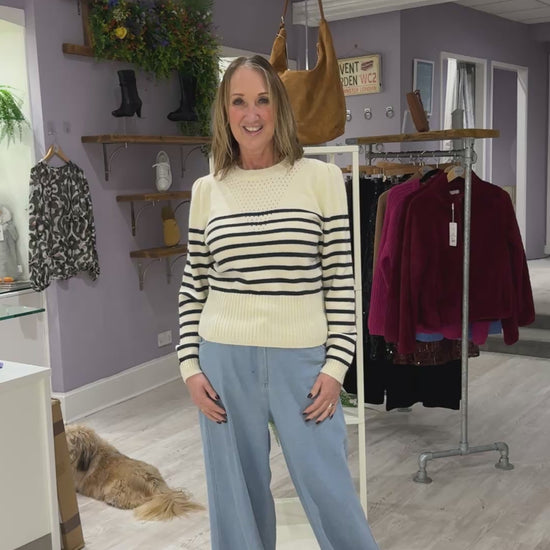 This super-soft jumper is designed with effortless elegance in mind. Featuring a timeless navy stripe, a classic round neck with laser-cut V-panel detailing, and long sleeves with a subtle puff at the shoulder, it’s the perfect blend of comfort and considered design. A refined staple you’ll reach for again and again.