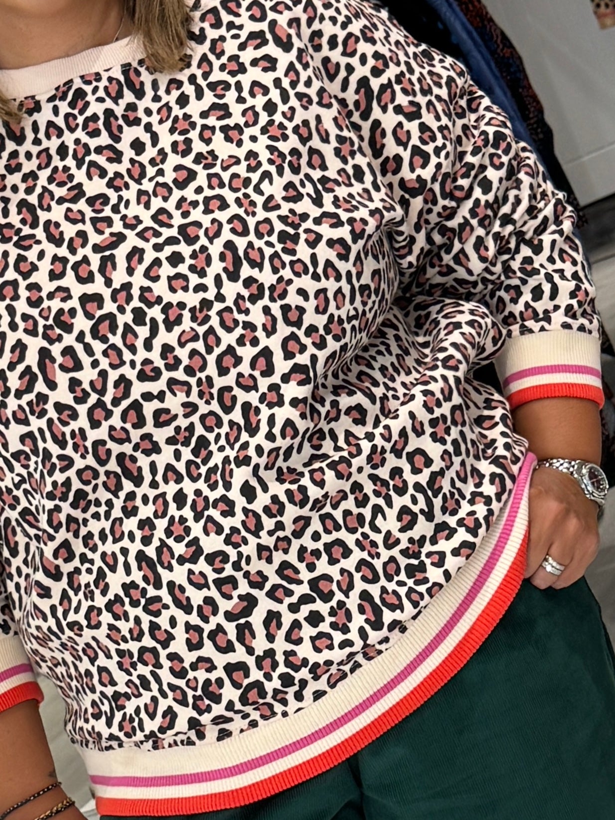 Relaxed, bold, and irresistibly soft — the Eadie Oversized Sweatshirt is made from 100% Organic Cotton Jersey for ultimate comfort. This hypoallergenic crew neck sweatshirt features a natural-toned leopard print, contrasted by striped ribbed trims at the cuffs and hem in vibrant coral and pink. The drop shoulders and oversized fit create a laid-back silhouette, while the super soft interior makes it perfect for all-day wear. Style it with jeans or joggers for easy everyday cool. Oversized, size down if you don’t want a relaxed fit!