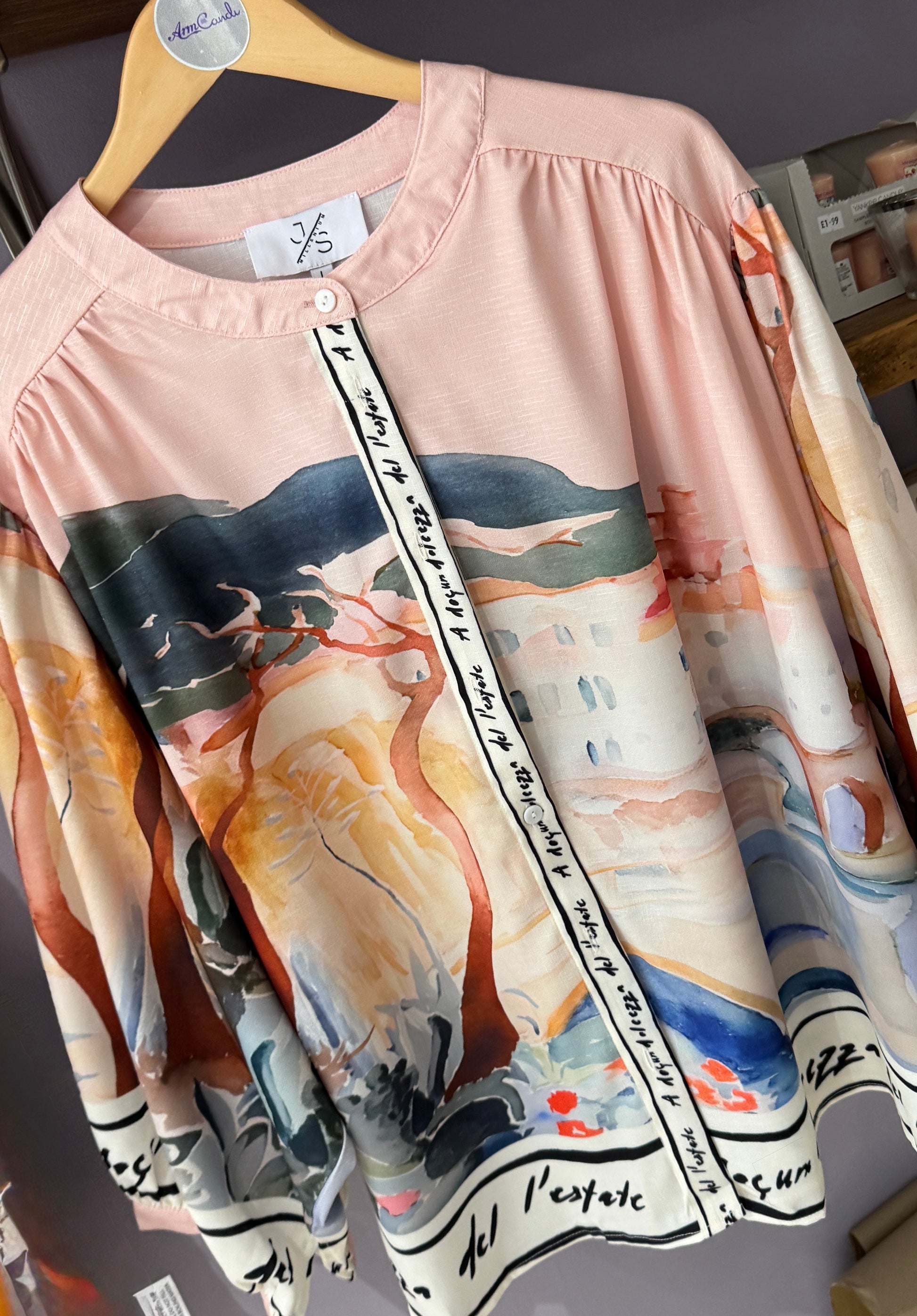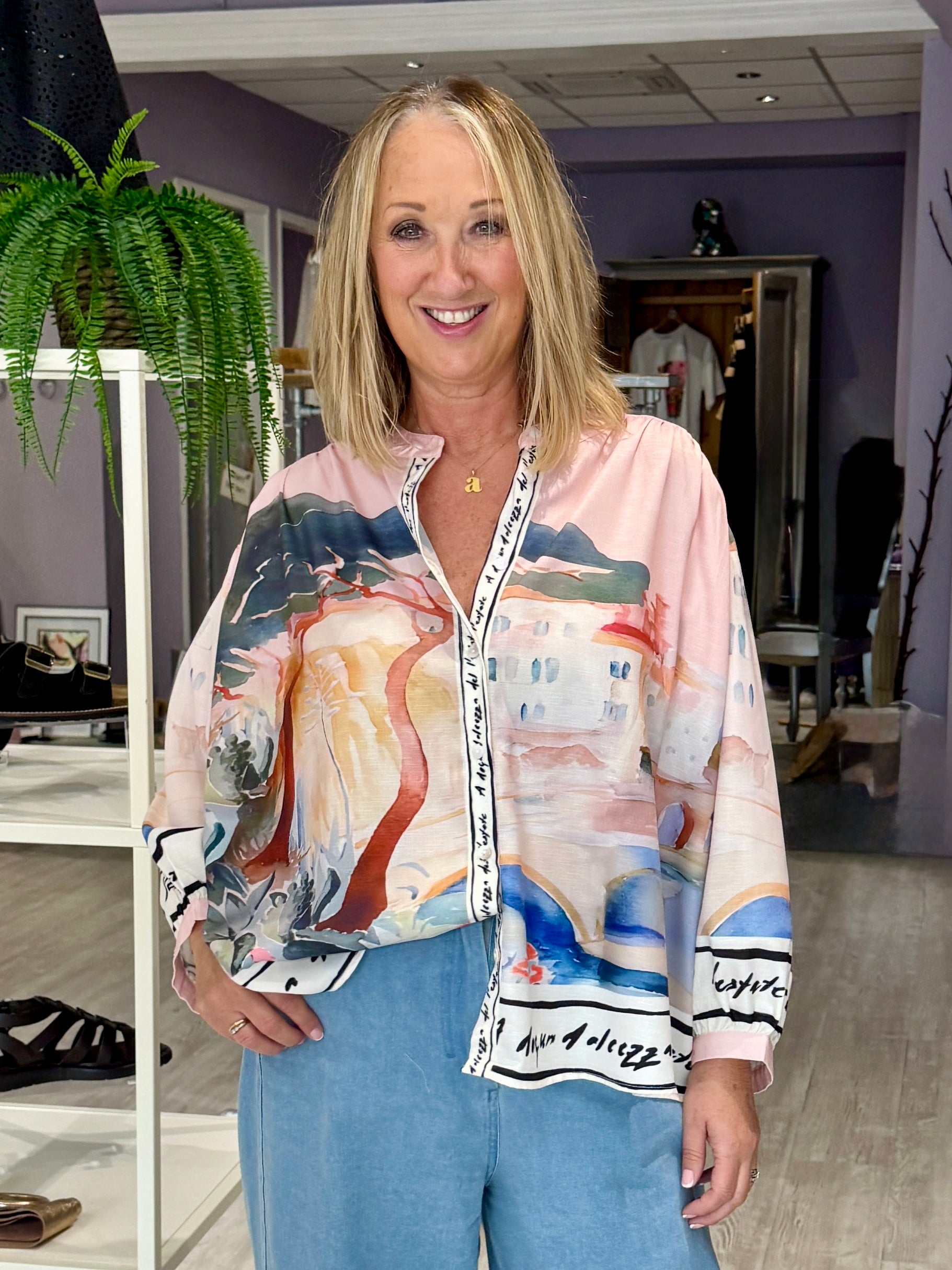 The Venice blouse in soft pink is just super stylish. It features a mandarin collar, front button fastening and the pattern that runs all the way around the body of the blouse adding to the European feel. They are a very generous fit with drop shoulders wide oversized statement sleeves so you may wish to size down.