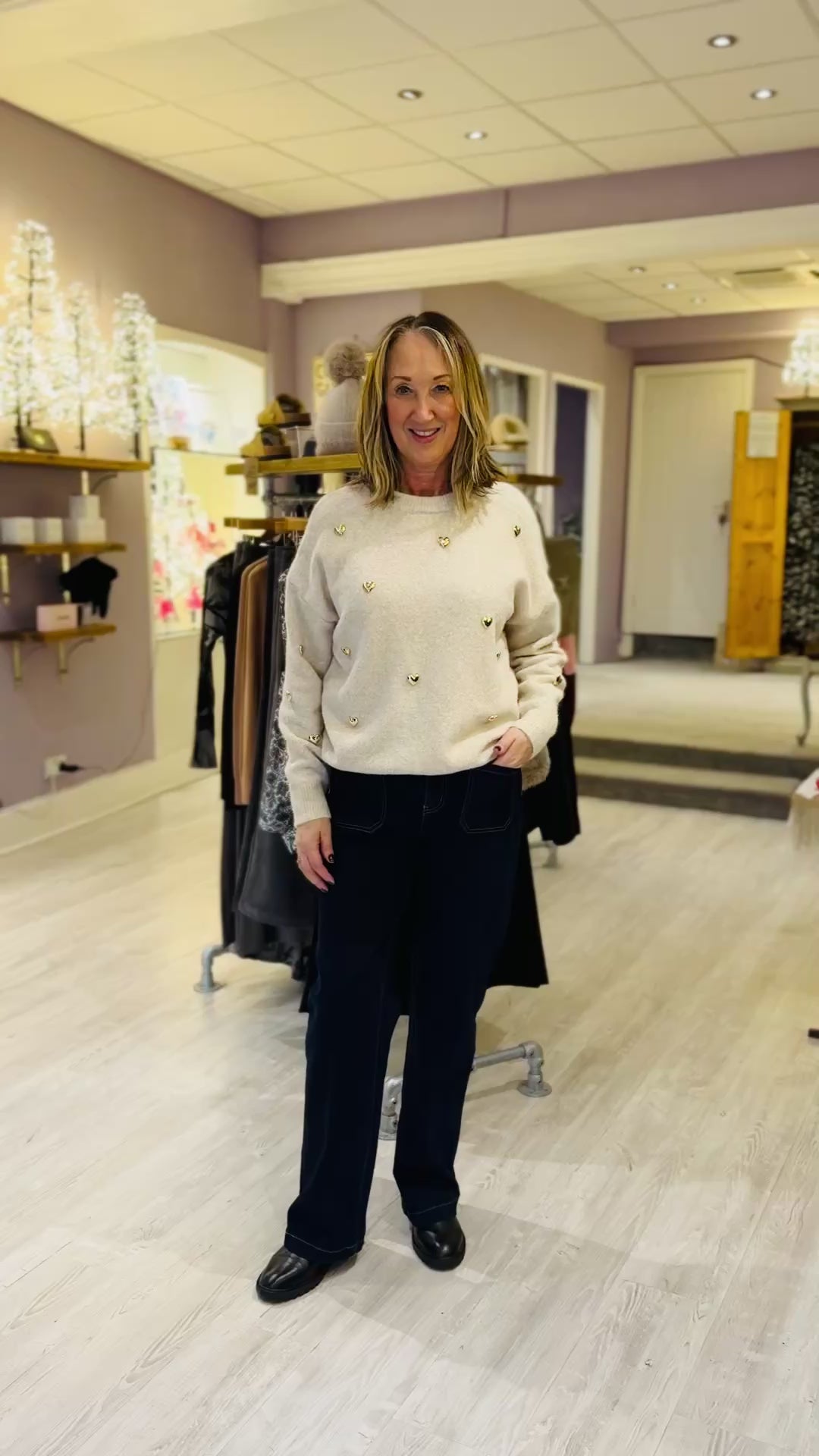 Wrap yourself in cozy charm with our Oatmeal Round Neck Jumper, finished with playful gold heart accents across the front and sleeve. Soft, warm, and irresistibly cute, this jumper adds a subtle sparkle to your everyday look. One Size to fit upto 16.